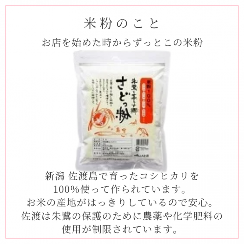 米粉(新潟(佐渡)製造) アーモンドプードル(スペイン製造) 片栗粉(国内製造) 有機ココナッツオイル(低温圧搾) 甜菜含蜜糖(北海道製造) 有機ココナッツクリーム 有機ココアパウダー 自然塩(沖縄製造)