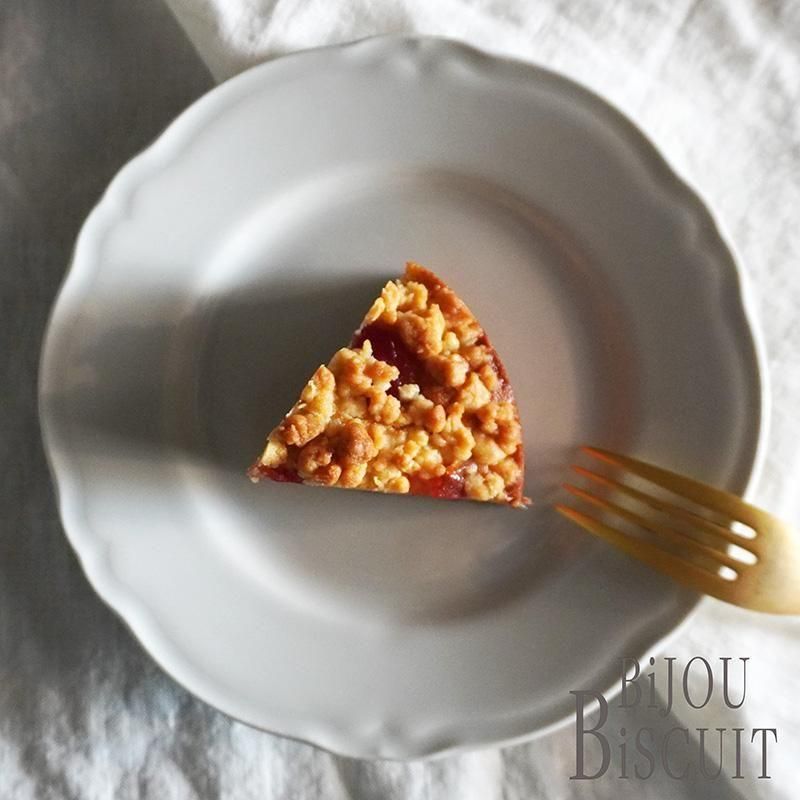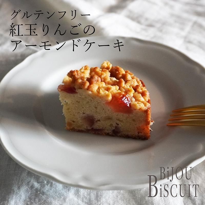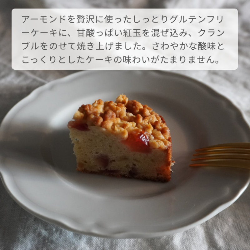 アーモンド粉を贅沢に使ったしっとりグルテンフリーケーキに、紅玉りんごをたっぷり混ぜ込み、クランブルをのせて焼き上げました。